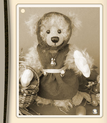 Größe: 15cm Material: Antik-Mohair/Mini-Kaschmir Füllung: Bastelwatte und Granulat Details: 5fach gegliedert, schwarze Glasaugen, gestickte und lackierte Nase, verdrahtete Arme, skulptierte Füße, Proviantkörbchen Besonderheiten: Kleidung aus Filz u. Waschleder Bärenmacherin: Cornelia Wilde Homepage: www.wildebaeren.de.vu >> weitere Bilder >> Inhaltsverzeichnis |