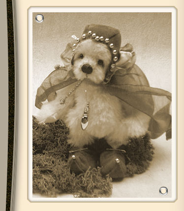 Größe: 14,5 cm Material: Alpaka und Suedine Füllung: Kapok und Granulat Details: 5 fach gegliedert, Wackelkopf und Biege- arme, gelackte Nase Besonderheiten: Umhang aus Voile, Kopfbedeckung und Schuhe aus Suedine, goldfarbene Glühbirne als Kette Bärenmacherin: Hildegard Leber Homepage: www.teddiesandfriends.de >> weitere Bilder >> Inhaltsverzeichnis |